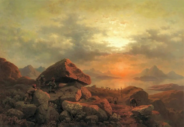他早年深耕挪威景致,以玄虚到极致的笔触搭配富裕戏剧性的光影,将山脉的巍峨、峡湾的普遍描述得鞭辟入里。朝阳漫过嶙峋山岩时的妍丽,暮色掩盖峡湾时的迷茫,齐在他笔下褪去平淡,尽显当然景致的磅礴张力,让不雅者仿佛将心比心,触摸到挪威地面的粗粝与壮阔。